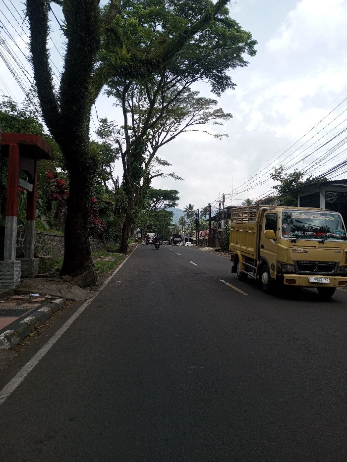 The image depicts a roadside scene in Khajuripada, India, under an overcast sky. A dark asphalt road, marked with a continuous white line on the left and broken white lines in the center, extends into the distance. On the left, a paved sidewalk with black and white curbing borders a dirt strip, which then meets a stone retaining wall. A partial red and white concrete structure is visible on the far left. A large tree with a thick, dark, moss-covered trunk stands prominently on the left, with dense green and red foliage behind it. A line of other trees with full canopies extends along the left side of the road. On the right side of the road, a yellow Mitsubishi light truck, resembling a dump or flatbed model with a wooden cage frame, drives towards the viewer. Its front license plate, F 8823 YC, is visible. Further down the road, a lone individual on a motorcycle travels away from the viewer, followed by other indistinct vehicles. Buildings with diverse architectural styles and multiple utility poles with complex wiring systems line the right side of the road. Distant hills or mountains are discernible on the horizon beneath the clouds.