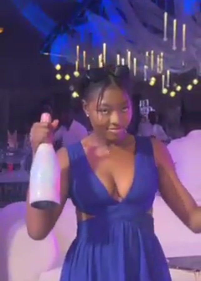 A dark-haired woman in a blue dress stands in what appears to be a party setting. She is holding a white bottle, likely champagne, in her left hand. She smiles and points with her right hand. She also has sunglasses on top of her head. The background shows other people, white furniture, and decorations. The lighting is primarily blue.