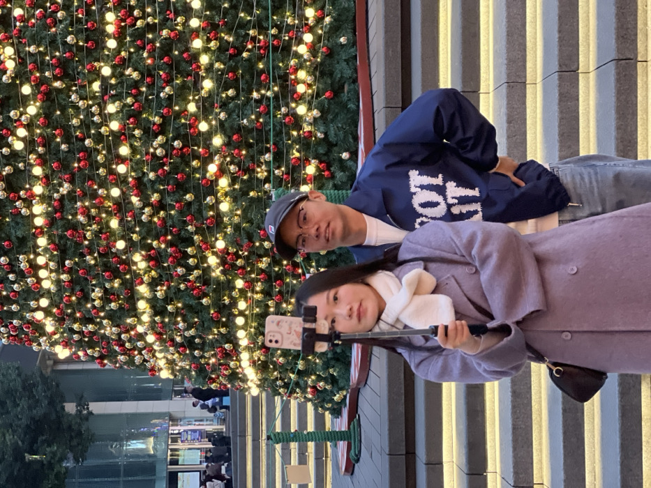 Two individuals are standing in an urban plaza in Yuzhong District, China, positioned in front of a large, illuminated Christmas tree
