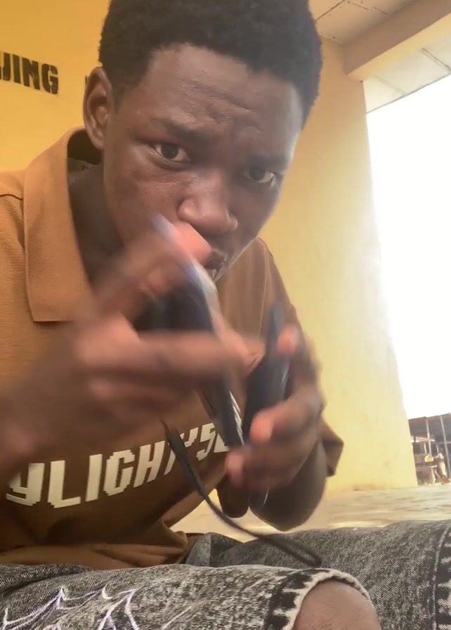A young Black man sits in an outdoor area, holding a calculator in one hand and its back cover in the other