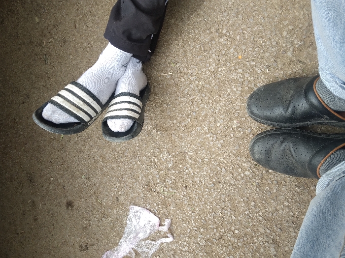 The image presents a ground-level view in Meknes, Morocco, focusing on the lower extremities of two individuals on a light tan, coarse concrete or asphalt surface. In the foreground, the observer's feet are visible, wearing light blue denim jeans, grey socks, and black, perforated slip-on shoes with a dark brown trim, consistent with clogs or mules. In the upper right, another person's feet are crossed at the ankles, clad in light grey socks and black Adidas Adilette-style slides with three white stripes, accompanied by black trousers. To the upper left, a crumpled, transparent plastic bag, either light pink or white, rests on the ground, containing indeterminate material. The scene is illuminated by diffuse ambient light.