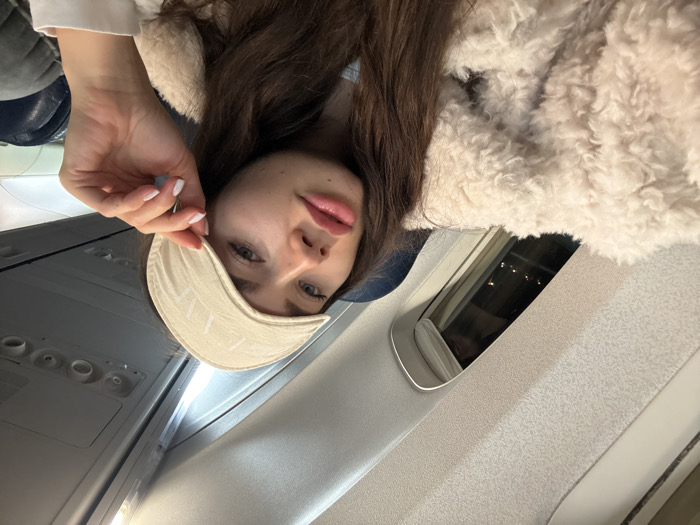 A woman on an airplane poses for a selfie. She is wearing a fuzzy cream-colored coat and has long brown hair. She holds a sleeping mask in her hand, partially covering her forehead. The airplane window shows a dark night sky with distant city lights. The airplane's interior, including the ceiling, seat, and side panel, is visible, adding context to the scene. The overall image has a slightly rotated perspective.