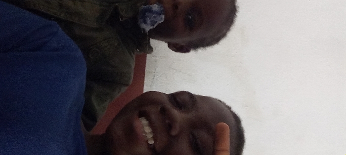 An indoor scene in Ogbomosho, Nigeria, features two dark-skinned individuals, likely children or young adolescents, positioned in close proximity to the camera against a plain, light-colored wall with a lower dark reddish-brown horizontal band. The individual on the left, partially framed, wears a dark olive-green collared top and has a blue, irregular object protruding from their mouth. The individual on the right, positioned more centrally and closer to the viewer, displays a wide smile revealing upper teeth. Their right hand is raised near their temple, with the index and middle fingers extended upwards.
