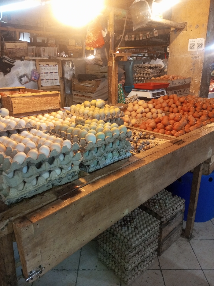 A market stall displays an assortment of eggs: white, brown, and blue-green, neatly arranged in cardboard cartons. Quail eggs are also present. The eggs are positioned on a sturdy wooden counter, with stacks of cartons stored underneath. Behind the stall, a scale sits amidst the eggs, and a veiled woman attends to the display. The scene is illuminated by overhead lighting.