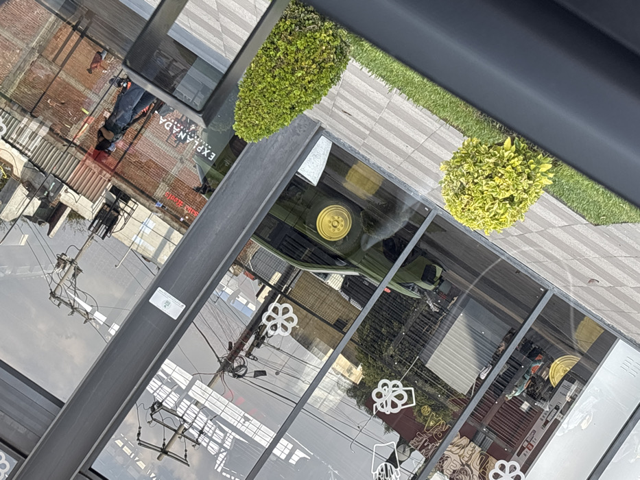 The image depicts an exterior view through a vehicle window, angled to capture the reflective glass facade of a building identified by the reflected text "Explanada PUEBLA," located in Puebla, Mexico. The scene is dominated by reflections of the environment opposite the building. Visible reflections include: * A person dressed in dark clothing (possibly a jacket and jeans) standing or walking near the building's entrance. * A dark green pickup truck or SUV with distinctive yellow wheels, positioned as if on a road or parking area. * A utility pole with multiple cross arms, wires, and transformers. * Other structures, including brick walls and rooftops, indicative of an urban setting. * Sky conditions appear overcast or partly cloudy. * Additional reflected text "solo a domicilio" (delivery only) is partially visible. Affixed to the interior side of the glass are several white decals depicting a flower, a cupcake, and a hot beverage cup. A small green and white sticker is also present on the glass. The building's glass panes are separated by dark grey vertical mullions. In the immediate foreground, outside the building's glass, are two spherical, variegated green and yellow bushes. These bushes are positioned on a strip of green grass that borders a light-colored paved walkway featuring a striped pattern of alternating light and dark grey segments. The lower right and bottom edges of the image show the dark grey interior of the vehicle from which the photograph was taken.