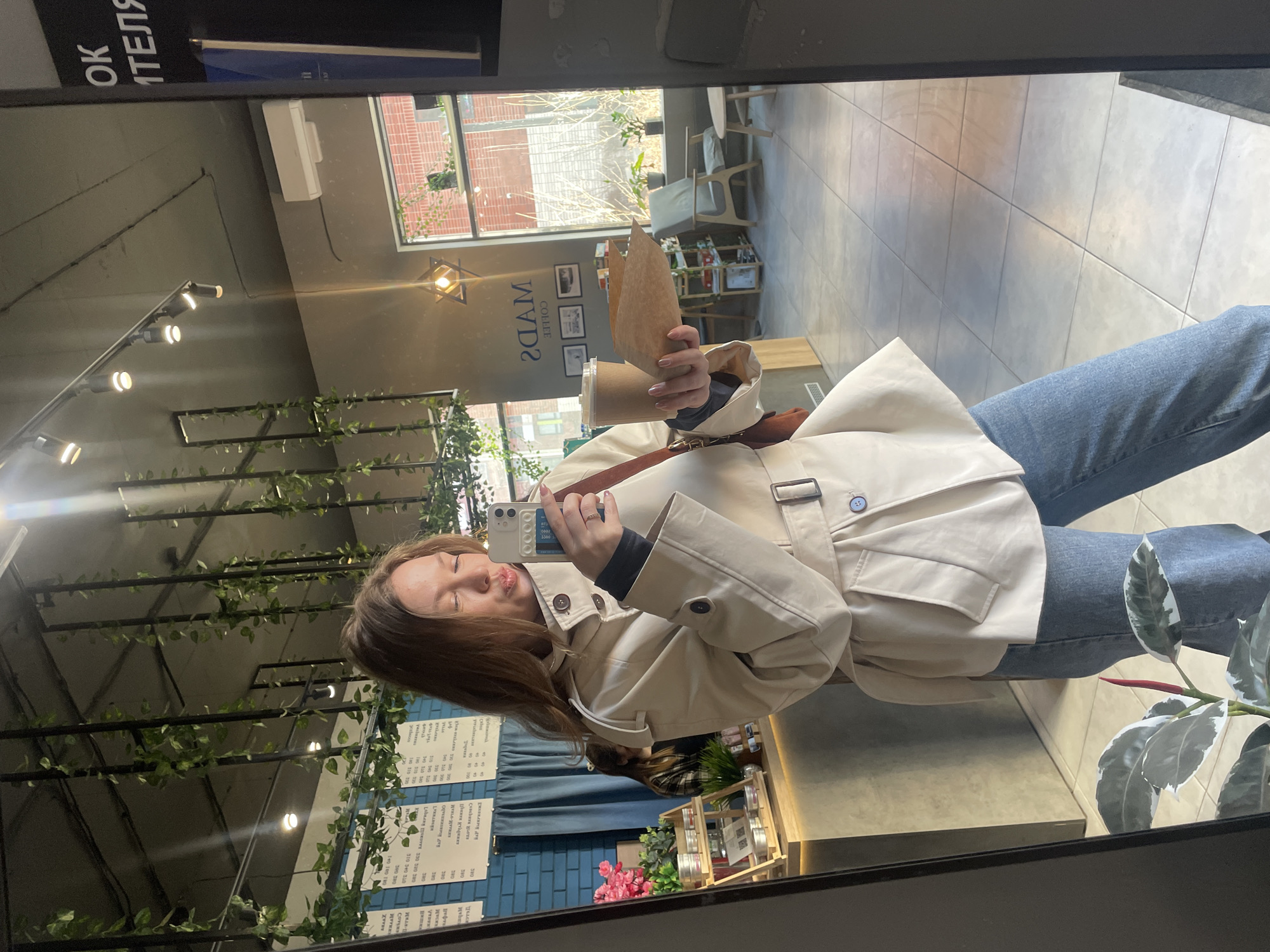 woman posing in the reflection of a mirror in a cafe. She is holding a disposable cup of coffee and a brown paper bag. She is wearing blue jeans and a beige trench coat. The interior of the cafe includes a menu board with text in Russian and the name "MAD's COFFEE 2ТАМ," indicating this is a coffee shop. Based on the name of the establishment and the text on the menu, it is likely in or near the city of Kommunarka, Russia. The environment appears to be a contemporary and well-lit cafe setting with plants, flowers, and modern decor.