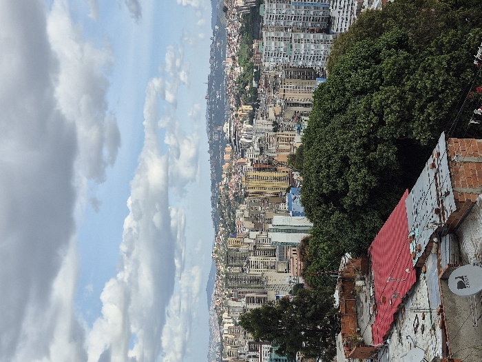 A cityscape sprawls in the background, a dense mix of buildings stretching to the horizon. Lush green trees punctuate the urban landscape. In the foreground, a shanty structure is visible, with a red roof and a satellite dish attached. The sky is filled with dynamic clouds, ranging from bright white to dark gray. The image offers a contrast between the densely populated city and the informal settlement, all under a dramatic sky.