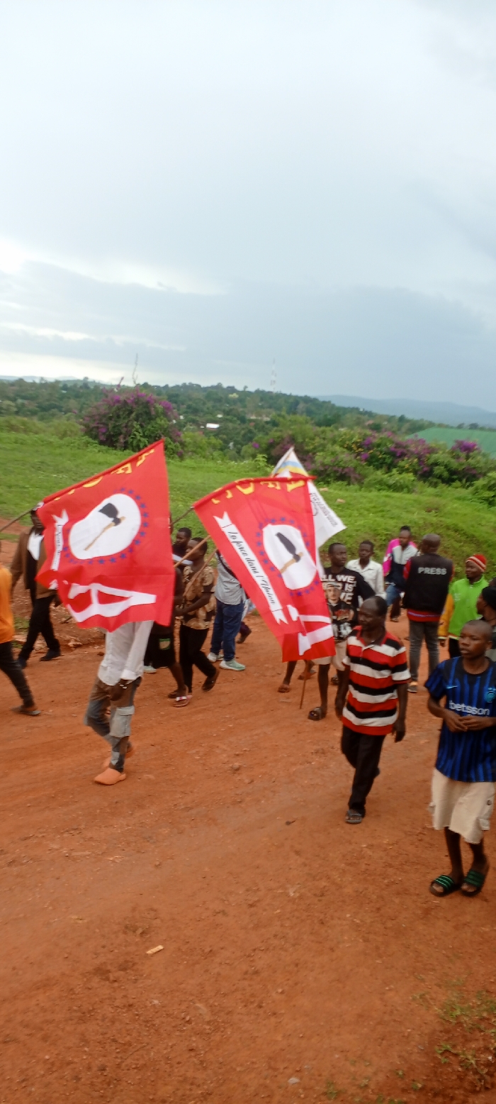 A group of approximately 15 to 20 individuals, predominantly males, is observed walking from left to right on a reddish-brown dirt road under an overcast, light-grey sky. The scene is set in the city of Rtnc, Democratic Republic of the Congo. The road is flanked by lush green hills covered in dense vegetation and scattered purple flowering bushes. In the distant background, structures indicative of a settlement and a prominent communication tower are visible amidst the hilly terrain. Several participants are carrying red rectangular flags mounted on poles. Each flag displays a central white circular emblem containing a crossed black pickaxe and hammer, surrounded by a ring of blue stars. Text visible on these flags includes "La force dans l'Union" (French for "Strength in Union") and "1er Nov Emploi Jeunesse" (French for "1st Nov Youth Employment"), along with a partially visible word resembling "EPJESEN". One individual in the mid-ground wears a black vest with "PRESS" printed in white on the back. Another person wears a red and black horizontally striped polo shirt. In the foreground right, a young male wears a blue and black striped shirt bearing "betsson" and "inter" logos, white shorts, and green slide sandals. An individual in the foreground left is dressed in light-colored, possibly patched, long pants and orange-brown slip-on shoes. The collective action of walking together with banners indicates an organized procession, march, or demonstration.