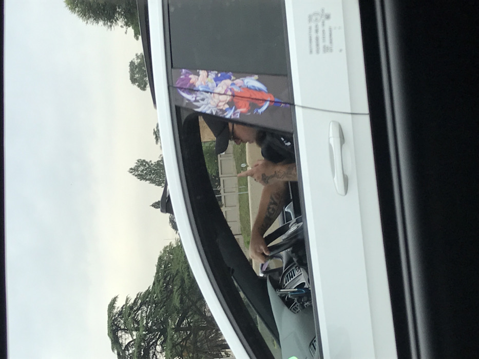 A photo shows a white vehicle from an oblique angle, capturing the reflection in the driver's side window. A man wearing a black cap and shirt is seen in the driver's seat, giving the middle finger. He has tattoos on his arms. Above the driver, a colorful image is affixed to the window, depicting anime characters. Outside, trees are visible against a cloudy sky. The composition emphasizes the reflection and the gesture of the driver.