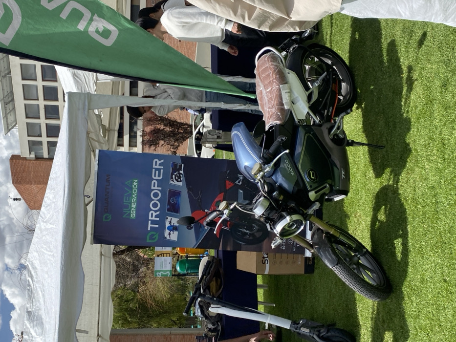 An outdoor product display is captured on a grassy lawn in Achocalla, Bolivia, under a partially cloudy sky. The scene features multiple display items from the "QUANTUM" brand, known for "NUEVA GENERACIÓN Q TROOPER" products. In the foreground, a dark blue Super Soco TC electric motorcycle is prominently displayed on its kickstand. It features a round chrome-rimmed headlight, silver handlebars, and a brown quilted seat covered in clear plastic. To its left, a white electric scooter is parked upright. Behind these vehicles, a large vertical banner displays the "QUANTUM NUEVA GENERACIÓN Q TROOPER" branding, alongside images of a drone, a screen, and a motorcycle wheel. A brown cardboard box is visible near the scooter. Further to the right, a green flag banner with "QUANTUM" branding is partially visible. Two white canopy tents shelter the display area. Several individuals are present: one person in a light-colored long-sleeved shirt stands to the right, partially obscured by the green flag. Another individual wearing a light-colored hoodie and jeans is visible under a tent in the middle-background, looking downwards. A hand is visible on the far left, suggesting another person near the scooter. In the background, behind the tents and people, a multi-story building with numerous windows is visible, along with a brick building and distant trees. White cars are parked further back, indicating a nearby road or parking area. The strong daylight casts distinct shadows on the grass.