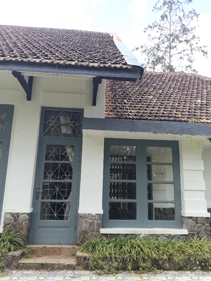 The image displays the exterior facade of a building in La Castellana, Philippines, under a bright, partly cloudy sky. The structure features white-painted upper walls atop a lower foundation constructed from irregularly shaped, dark-toned stones. The roof consists primarily of reddish-brown clay tiles, with a section near the peak showing a repair or extension with corrugated metal sheeting. A dark-colored gutter system runs along the eaves, supported by dark brackets. A muted blue-grey paneled door is positioned on the left side of the frame, featuring multiple glass inserts protected by decorative metal grilles forming circular and geometric patterns. This door is accessed via several stone steps, which, along with the adjacent patterned tiled ground, show scattered weeds and dirt. To the right of the door is a multi-pane window, also painted the same blue-grey, with clear glass revealing an internal, accordion-style metal security gate in a closed position. Low-lying green foliage grows along the base of the stone foundation. A tall, slender tree with sparse foliage is visible against the sky in the upper right background. No individuals are present in the scene.