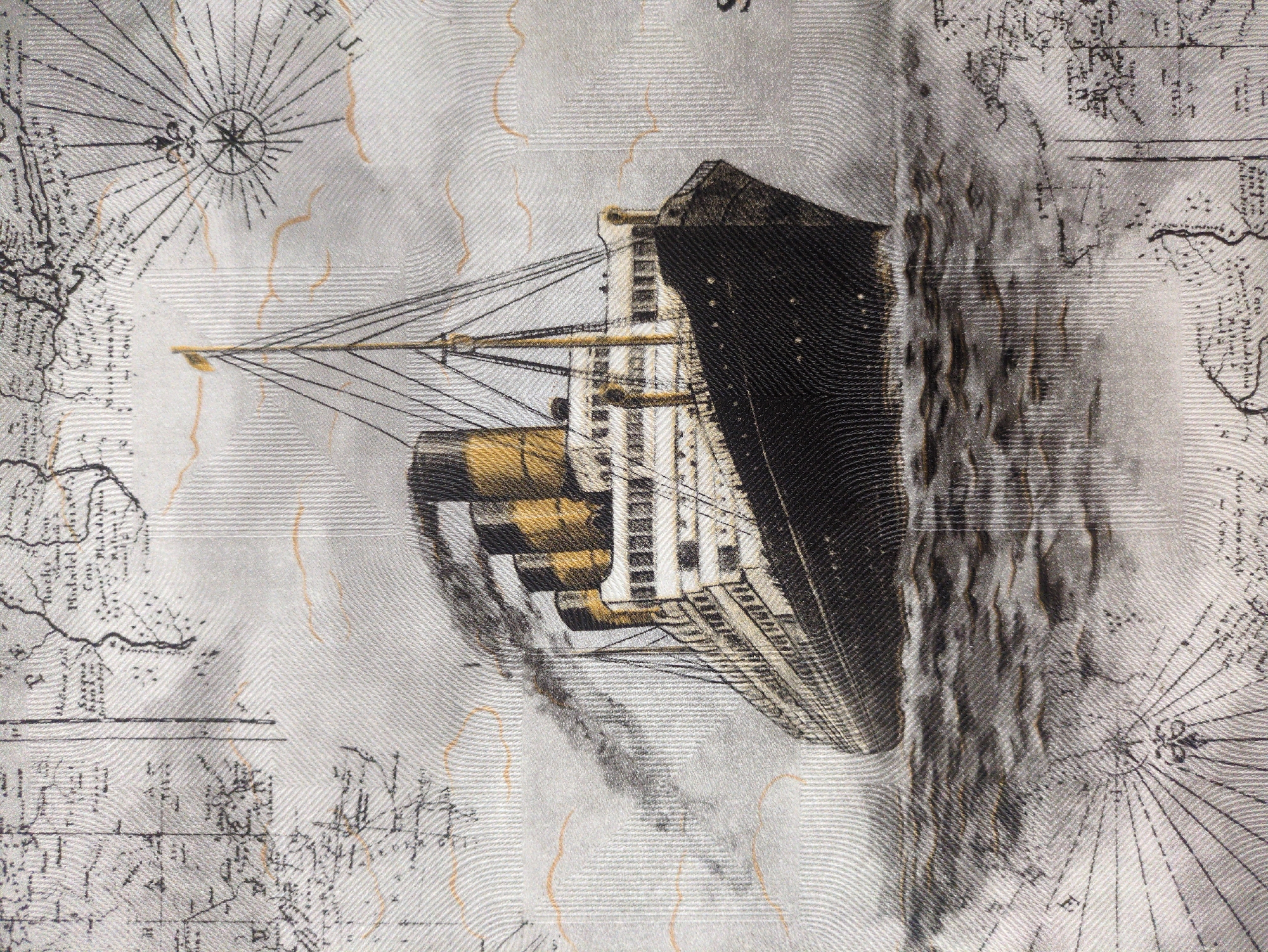 A detailed rendering of a ship sailing across an old map is visible. The ship is on its side. It has black and white features along the length of the hull. On the rear side are three large yellow smokestacks. Masts and rigging extend out over the map. The map includes coastlines, longitude and latitude lines, and cartographic renderings of land. The scene is depicted on a textile with a striated texture. The location in South Quy Nhon Ward, Vietnam is not relevant to this image.
