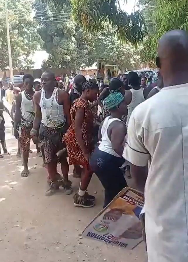 The video depicts a group of people dancing outdoors during the day. The dancers are wearing various outfits, including tank tops, patterned shorts or skirts, and beaded necklaces. Some carry small wooden sticks. A few wear traditional-style leopard print clothing. A sign with the word "Vaccination" on it is visible. The crowd appears to be gathered under trees, and onlookers are filming the scene with their phones. The ground is covered with dirt and dust.