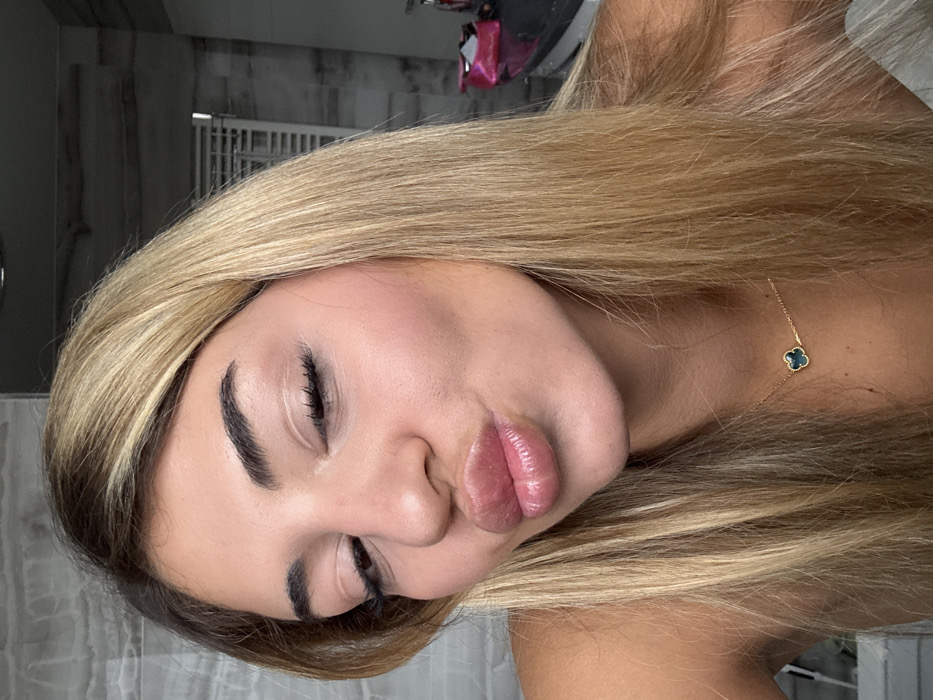A close-up, frontal portrait captures an adult female with long blonde hair, parted to her left, framing her face. Her eyes are mostly closed in a squinting gesture, and her full lips are pursed forward into a glossy "kissing" expression. She has dark, well-defined eyebrows. Around her neck, she wears a delicate gold chain necklace with a black four-leaf clover pendant. Her bare shoulders are partially visible in the lower frame. The background reveals an indoor setting, consistent with a modern bathroom, featuring light grey, textured wall tiles and a white, horizontal-slatted object, likely a towel warmer or radiator, on the right. A dark countertop is visible on the far right, displaying a pink pouch and other small, dark items. The scene is set indoors, likely within a modern bathroom in Lich, Germany.