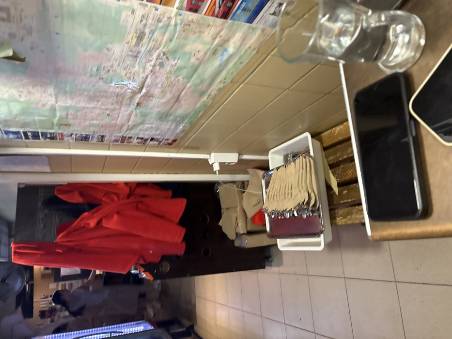 The image depicts an interior scene, likely within a casual eatery or service establishment in Haskovo, Bulgaria. In the left background, a female individual with dark hair, wearing a light-colored top, is visible standing behind a counter or workstation, engaged in an activity. To her right, a tall, dark cabinet or partition is present, from which several bright red jackets are suspended on hooks. Beneath the jackets, brown paper bags are stacked. The floor in this area is composed of light-colored square tiles. To the right, a wall covered with light beige rectangular tiles displays a large, folded map, likely a local or regional map, secured to its surface. A white electrical outlet with a connected white cord is mounted on this tiled wall. Below, on a wooden slat structure, a white rectangular plastic tray holds a metal tray containing numerous pieces of cutlery, each individually wrapped in a brown paper napkin. In the immediate foreground, a metallic-surfaced table holds two smartphones, both appearing black with dark screens, and a clear glass tumbler filled with water.