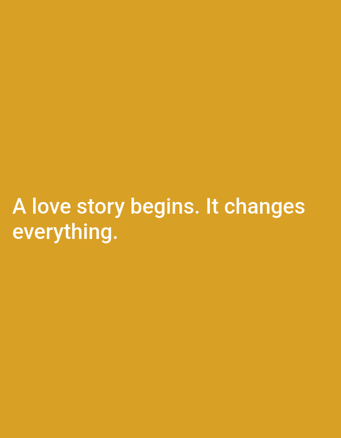 The digital image, originating from Kharkiv, Ukraine, displays white text centered against a solid, untextured mustard yellow background. The text, rendered in a sans-serif typeface, reads: "A love story begins. It changes everything." The phrase is arranged in two lines, with "A love story begins. It changes" occupying the upper line and "everything." on the lower line, positioned in the lower-middle section of the frame. No discernible subjects, objects, people, actions, interactions, or environmental features are visually depicted within the image beyond the text and background color.