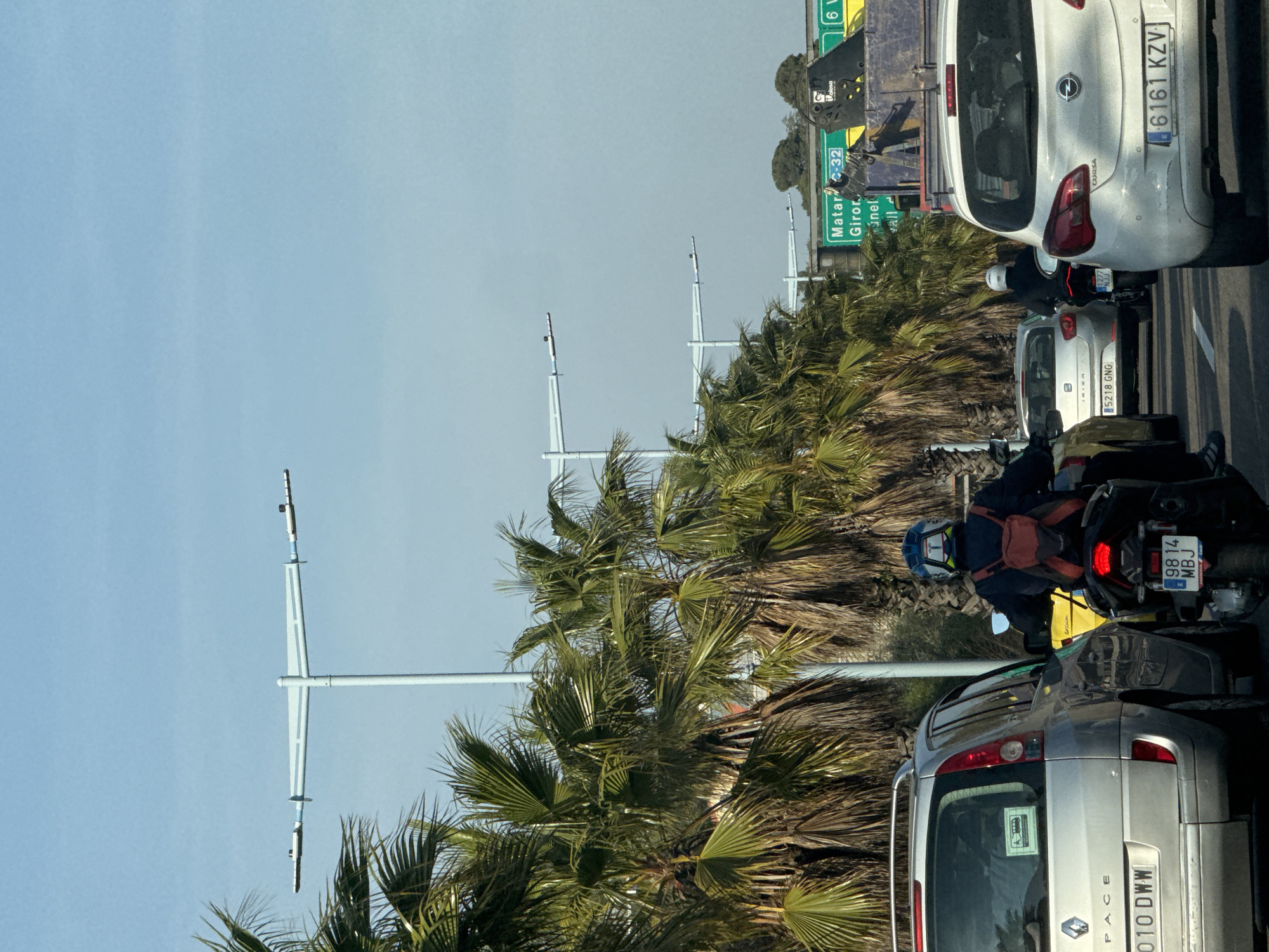The image depicts a multi-lane highway scene in or near Barcelona, Spain, specifically on the C-32 (Autopista de Pau Casals) heading northbound towards Mataró and Girona, as indicated by a green overhead road sign. Traffic is either stationary or moving slowly under a clear, light blue sky. In the foreground, from left to right, are the rear sections of three vehicles. A silver Renault Espace minivan (license plate "010 DWW") is on the left. In the center, a black Honda motorcycle (license plate "9814 MBJ") is positioned directly in front of the viewer, with its rider wearing a blue and white helmet and a red and black backpack; the motorcycle's taillight is illuminated. To the right, a white Opel Corsa hatchback (license plate "6161 KZV") is visible. Further back in the mid-ground, a yellow vehicle is partially obscured behind the motorcycle. Beyond it, a silver SEAT Ibiza hatchback (license plate "5218 GNG") is visible. Another black motorcycle with a rider in a white helmet (license plate "1277 NJJ") is positioned behind the white Opel Corsa. In the far right background, a dark-colored dump truck with a visible crane mechanism is partially seen. The right side of the road is lined with a dense row of tall palm trees with green and some browning fronds. Above the trees, a series of modern, light-colored streetlights with distinctive horizontal, wing-like fixtures extend into the distance. White lane markings are visible on the asphalt road surface. No direct interactions between individuals are discernible.