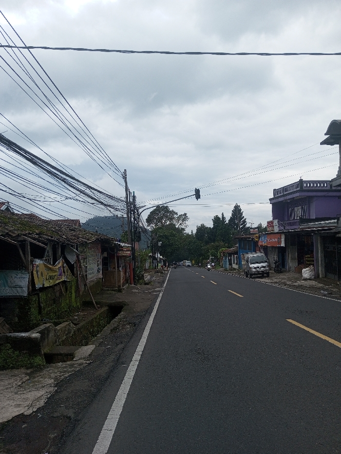 A straight asphalt road cuts through a landscape of aging buildings and lush greenery under a cloudy sky. The road is lined with structures on either side, ranging from weathered, moss-covered shacks to more substantial buildings painted in shades of purple and blue. A web of tangled power lines stretches overhead. Cars and a motorcycle are visible further down the road. A mountain is faintly seen in the distance.