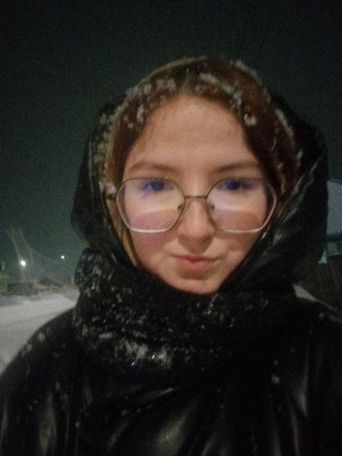 The image depicts a single female individual in an outdoor, nighttime setting in Kuyeda, Russia. The environment is characterized by active snowfall or recent heavy snow, evident from snow accumulation on the subject's brown hair, the dark hooded winter coat, and a dark, textured scarf or high collar. The subject wears round-framed eyeglasses, which show reflections from ambient light sources. Her facial complexion appears flushed, consistent with cold exposure. In the background, a snow-covered ground or unpaved road is visible, extending into the distance where faint artificial lights, presumably streetlights, illuminate the scene. Indistinct, dark outlines of structures are visible behind the distant lights, suggesting a populated but dimly lit area during winter conditions.