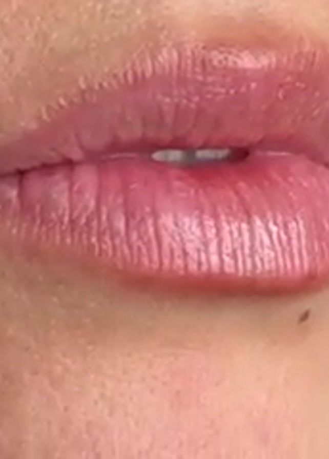 A close-up shot depicts a person applying lip gloss to their lips with a wand applicator