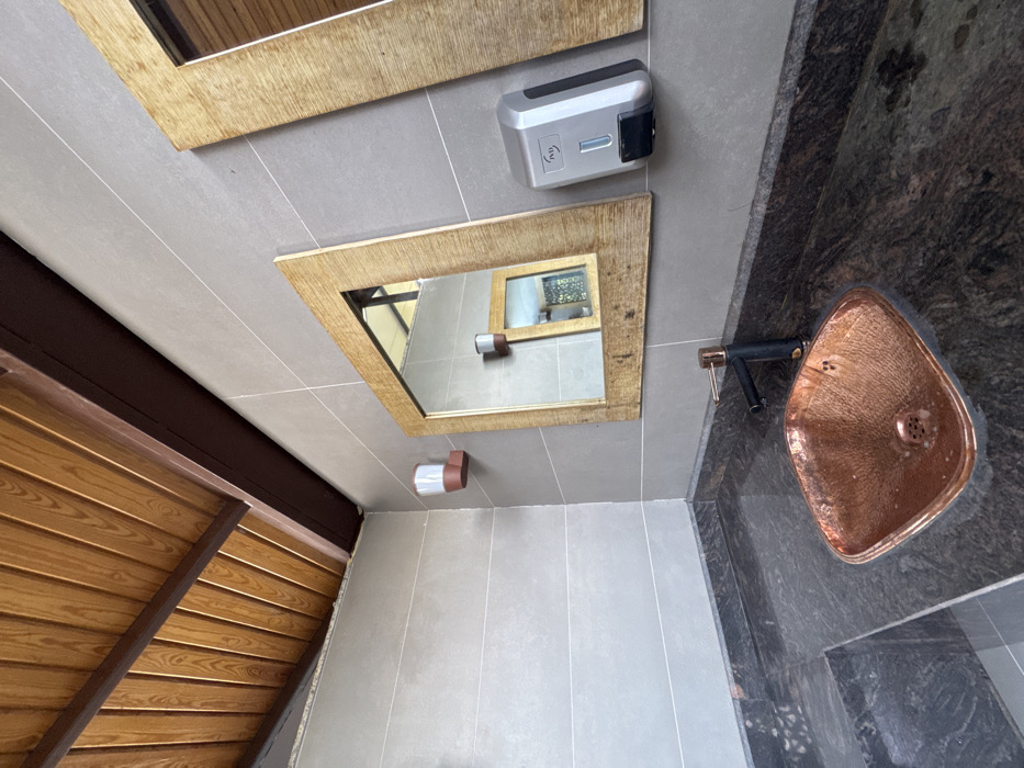 The image displays an interior washroom scene within the city of Majjate, Morocco. The environment features light grey horizontal wall tiles and a dark, speckled granite countertop. An angled ceiling constructed from parallel wooden slats supported by dark brown beams is visible overhead. A square, hammered copper basin is integrated into the countertop, with a modern black faucet featuring a rose gold or copper-toned handle situated behind it. A rectangular mirror with a light wooden, textured frame hangs on the wall above the basin, reflecting a portion of the opposite wall and another identical mirror. To the left of the mirror, a wall-mounted light fixture with a white opaque cylindrical diffuser and a brown base is present. To the right of the mirror, a silver and black manual soap dispenser, labeled "DVD," is affixed to the wall. The scene is absent of any individuals, actions, or dynamic interactions.