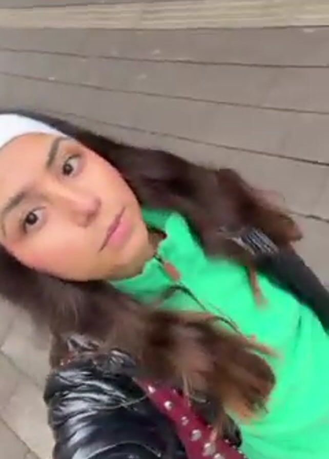 A young woman is recording a selfie video as she walks down a paved street