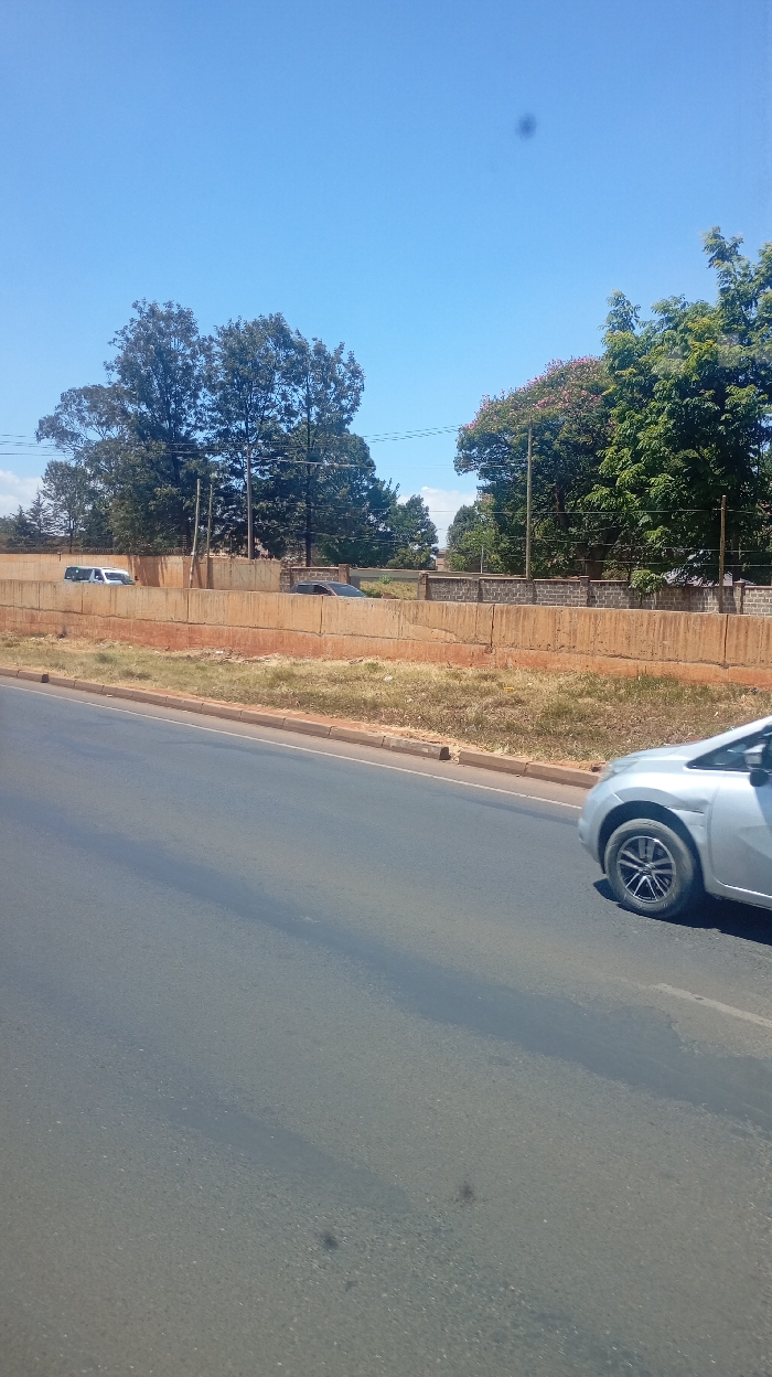An eye-level shot captures a road with a silver car partially visible in the right foreground. Beyond the road, a concrete barrier rises, topped with sparse grass and trees in the background. Two vehicles are parked behind the barrier. The sky above is clear and blue, with trees of varying shades of green framing the scene. A dark blemish mars the clear sky.