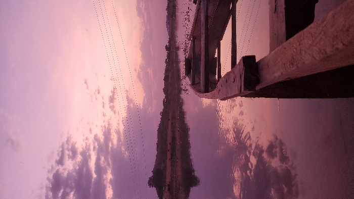A wooden boat's side and rails dominate the foreground of the photo, extending from the upper right corner across part of the center. The background displays a body of water reflecting a pink and purple-tinged sky with clouds. On the horizon line is greenery, possibly trees, and a series of power lines stretching across the sky. The overall hue of the image is pinkish-purple due to the sunset lighting.
