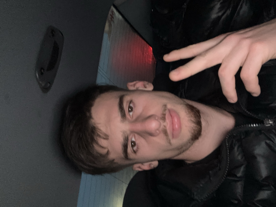 A young man poses in what appears to be the interior of a car. He wears a black puffer jacket and is giving the peace sign with his right hand. His hair is short and dark, with a light beard. A car window is visible in the background with a red light visible. The interior roof of the car is visible with a black handle. The lighting in the image is subdued.