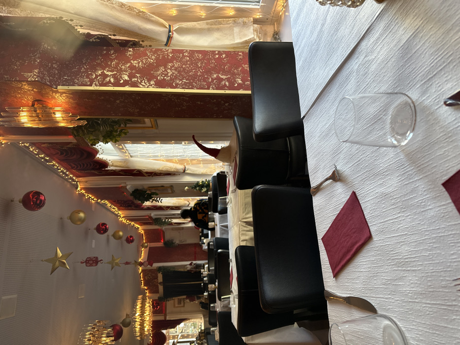 The image displays the interior of Restaurant Commihalle, situated at Predigerplatz 34 in Zurich, Switzerland. The scene captures a long dining area decorated for a festive season, likely Christmas, viewed from a foreground table. The walls are covered in red and gold patterned wallpaper, accented with red drapes and light-colored patterned curtains. String lights are draped along the ceiling, windows, and wall accents. Numerous red and gold spherical ornaments, gold stars, and elongated red decorations hang from the ceiling. Multiple chandeliers with reflective elements and gold-toned wall sconces provide illumination. In the immediate foreground, a table is set with a white textured tablecloth, a clear stemless glass on each side, a silver knife to the left, a silver four-tined fork to the right, and a folded red cloth napkin positioned centrally. Black leather-backed dining chairs are arranged around multiple white-linened tables extending into the background. In the mid-ground, one individual is seated at a table with their back to the viewer, wearing a dark garment with distinct yellow patterning. A small artificial Christmas tree is visible on a table to their right, and a red and white Santa hat rests on the back of a nearby black chair. Natural light enters through the windows on the right, complementing the interior artificial lighting.