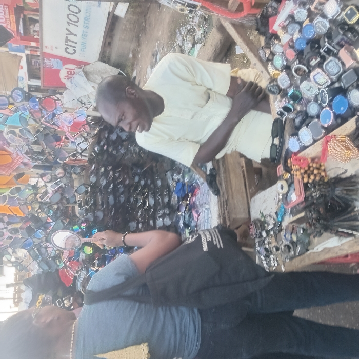 This image depicts an outdoor market scene in Maiburiji, Nigeria. In the foreground, a female individual, seen from behind, wears a grey short-sleeved top and dark jeans. She holds a small, round handheld mirror, positioning it towards a merchandise display. A black tote bag with white text is slung over her left shoulder. To her right, a male vendor, balding and wearing a light cream-colored short-sleeved garment, sits behind a wooden stall, his gaze directed towards the female. The wooden stall in front of the vendor displays a diverse range of items. On the right side, numerous watches of various shapes, sizes, and colors are neatly arranged on a tray. The left side of the stall features beads, bracelets, and small, dark stick-like objects bundled together. Resting on the stall's surface near the vendor are a pair of dark sunglasses. Behind the vendor and extending to the left, a dense collection of sunglasses is displayed, some hanging on a rack and others piled in baskets or on surfaces. The background reveals a somewhat cluttered urban environment, including a red advertising billboard for "Airtel" and another white sign with "CITY 100 FUN YET STRONG." The ground appears uneven and contains debris.