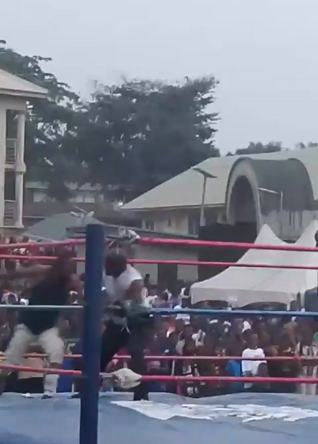 two people in a wrestling ring, surrounded by spectators