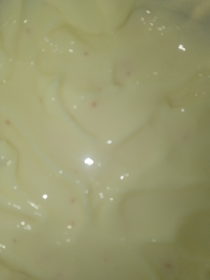 A close-up shows a smooth, creamy texture, possibly a dessert or sauce, light yellowish color with a glossy sheen from light reflections. Scattered throughout are tiny red specks, potentially fruit pieces or sprinkles. Faint swirling patterns are visible in the surface, suggesting it has been mixed or poured recently. A heart shape is faintly visible.