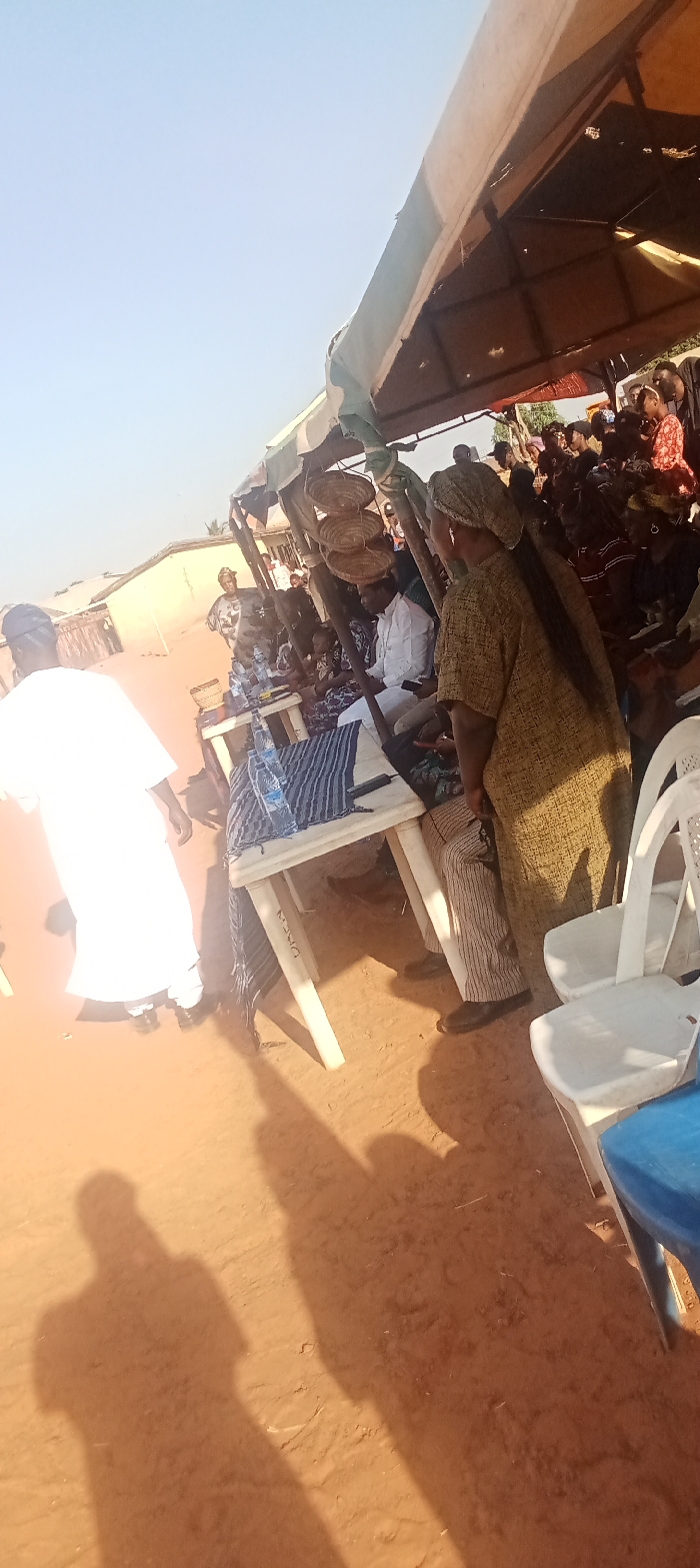 A gathering appears to be taking place outdoors under a makeshift shelter. People are seated, some at tables, with several empty plastic chairs nearby. The ground is reddish-brown, perhaps dirt or clay. A woman with long hair stands in a printed dress, facing the crowd. Other people are seated under the shelter, and some are standing around the periphery of the event. A building is visible in the background. The lighting suggests it is daytime, with distinct shadows on the ground.