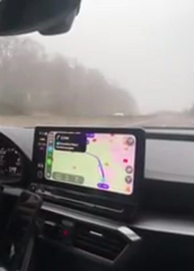 A person is driving a car on a highway. The weather is foggy, and trees line both sides of the road. The driver's hands are on the steering wheel, and the car's navigation system is displayed on a screen. The car's dashboard is visible.