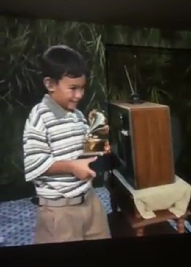 A low-resolution video shows a young boy holding a Grammy award
