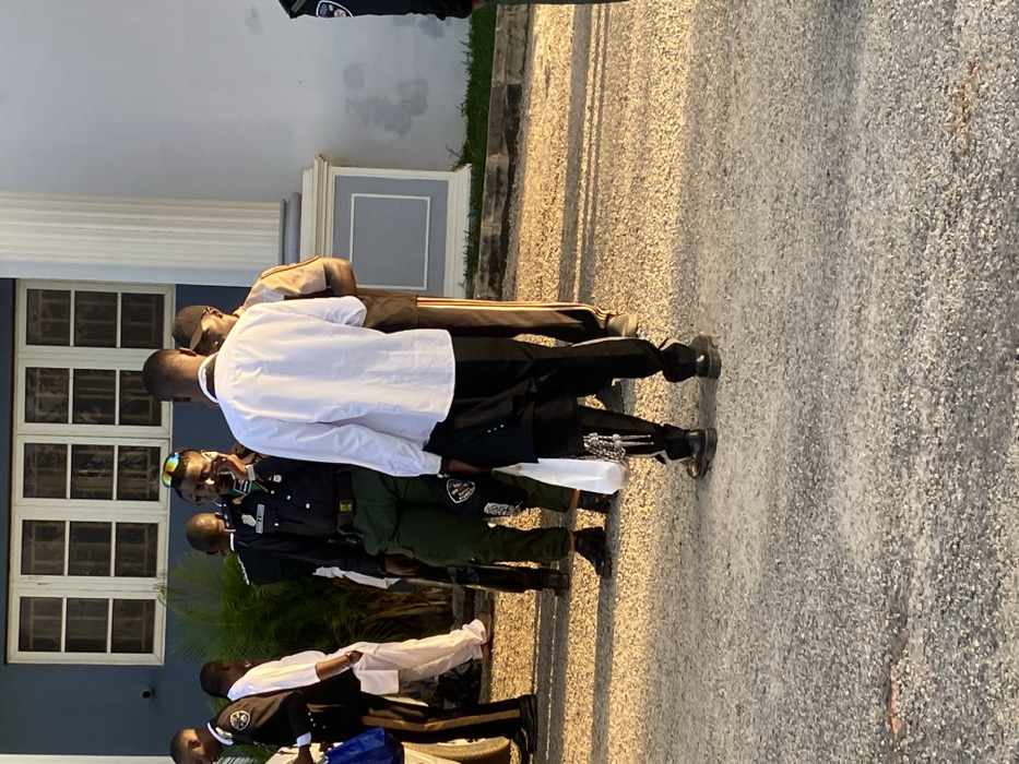 The image depicts an outdoor gathering in Jos, Nigeria, featuring approximately eight to ten individuals on a light-colored gravel surface in front of a blue building with white architectural trim and multiple rectangular windows. The lighting, indicated by shadows on the ground, suggests either morning or late afternoon. In the foreground, an adult male stands with his back to the viewer, wearing a white long-sleeved shirt, black trousers, and black dress shoes. He holds a black jacket or garment in his left hand, from which a white plastic bag containing numerous white/silver beaded items and a set of keys is suspended. To the left of this central figure, an adult male in a dark green and black uniform, characteristic of the Nigerian Police Force, is visible. He is actively speaking on a mobile phone held to his right ear, wears reflective sunglasses pushed up onto his head, and displays a badge on his chest and an emblem on his left leg. Adjacent to the uniformed officer, another adult male, partially obscured, wears a light brown polo shirt with dark sleeve stripes and a black baseball cap. Additional individuals are present in the mid-ground and background; some are in dark uniforms with light accents, similar to the police attire, while others are in civilian clothing, including one individual in white traditional attire and another on the far left holding a blue bag. A partial view of another uniformed person is visible at the far right edge of the frame. The individuals appear to be standing and engaged in conversation or waiting.