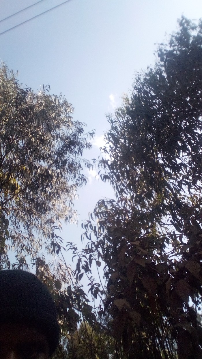 view of the sky framed by treetops on either side. The sky is light blue with a few wispy clouds. Tree branches and leaves fill the foreground, creating a slightly obscured perspective. In the lower left corner, a dark, indistinct shape resembling a head or object is partially visible. Utility lines run across the upper portion of the sky.