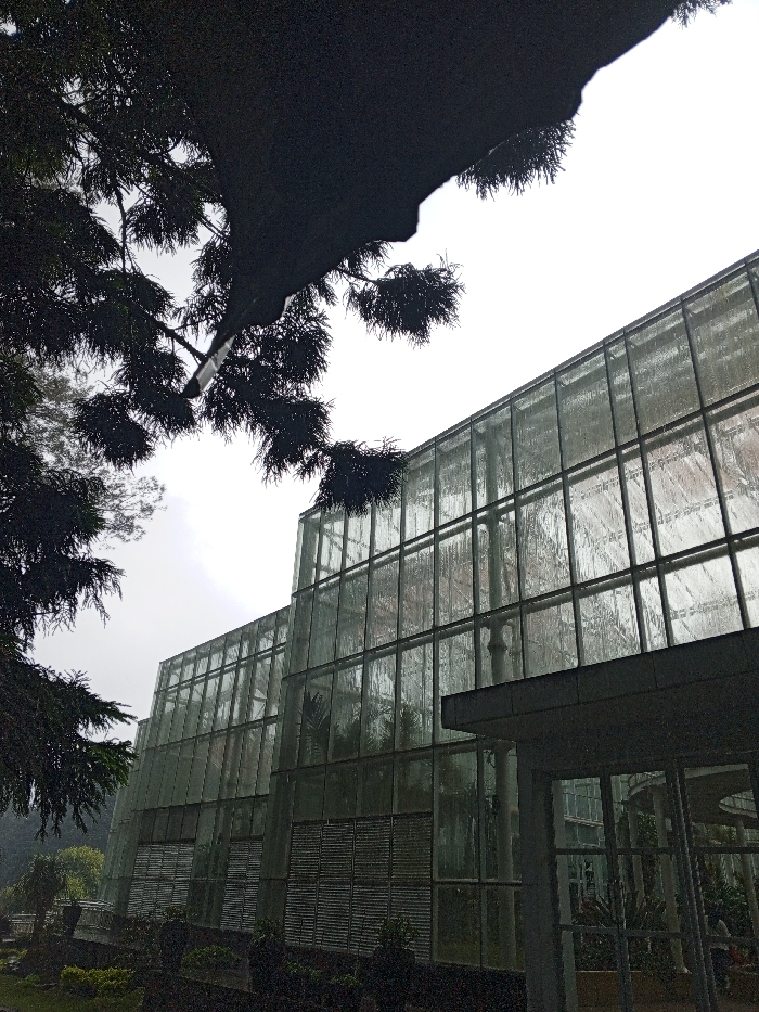 A glass-walled building, likely a greenhouse, stands under an overcast sky
