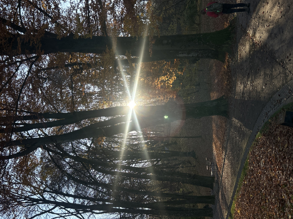 This image depicts an autumnal park scene in Lviv, Ukraine. The primary light source is a low-angle sun, positioned in the upper-mid-left, producing a prominent lens flare and long, distinct shadows across the landscape. Numerous tall, deciduous trees dominate the view, with dark trunks and branches. Many trees display golden-yellow and orange foliage, particularly those illuminated by the sun, while others appear mostly bare against a clear, blue sky visible through the canopy. The ground is densely covered with fallen brown and orange leaves. A winding, dark path, possibly gravel or packed earth, is visible, bordered by a low, curved brick edge on the left. This path extends from the lower-left foreground into the middle ground, ascending a gentle slope. In the mid-left background, two light-colored park benches are visible on the periphery of the path, currently unoccupied. A dark, rectangular object, possibly another bench, is partially visible in the lower-left foreground. In the lower-right portion of the frame, a single individual stands on the path, facing away from the camera. The person is wearing a red or dark pink hooded top, dark trousers, and dark footwear. A light-colored backpack, possibly olive green or light grey, is worn on their back. The individual is stationary, observing the environment. No other people or direct interactions are visible. The overall scene conveys a serene, sunlit autumn atmosphere.