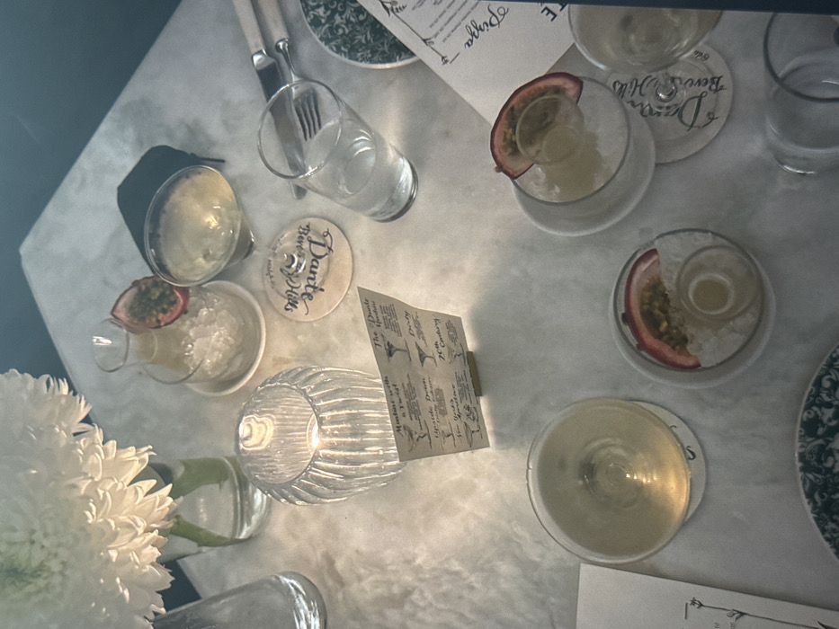 This overhead image depicts a well-appointed table at Dante Beverly Hills, located in Beverly Hills, Los Angeles, United States