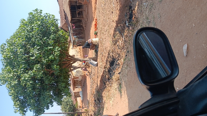 Rural scene with a large leafy tree beside a humble dwelling. Two figures appear to be working near the tree, possibly tending to something on the ground. The landscape is dry and earthy, with simple structures visible in the background. A side-view mirror of a vehicle intrudes into the right side of the frame. The image gives a glimpse into a modest, possibly impoverished, way of life.