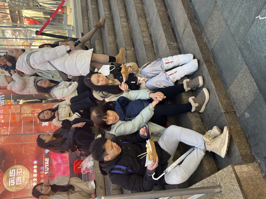 - "An outdoor scene in Yuzhong District, China, depicts a group of East Asian individuals gathered on wide stone steps in a commercial area" by FM-KHzZx1, licensed under CC BY 4.0