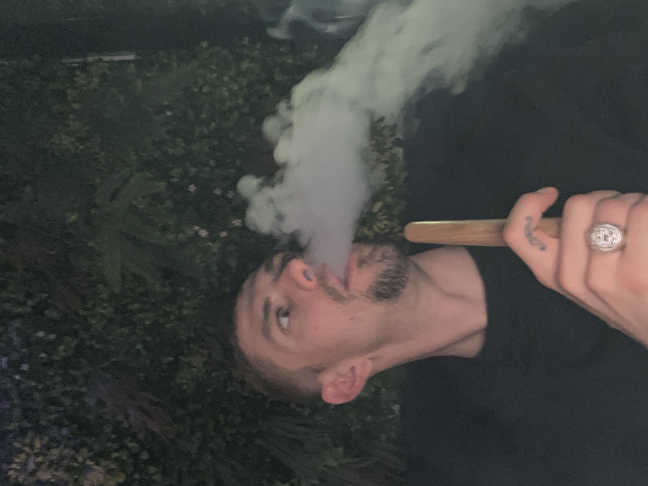 A man with short, light-brown hair exhales a thick cloud of white smoke. He holds a brown, cylindrical object to his mouth. The man has a light complexion and a neatly trimmed beard. He wears a black shirt. On his hand, he sports a large, ornate ring and a small tattoo on his finger. The background includes lush green foliage, suggesting an outdoor setting at night.