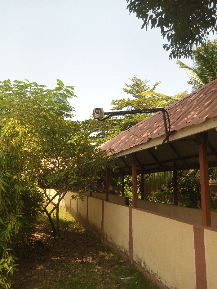 The image displays an exterior scene in Kaduna, Nigeria, under clear daylight conditions. In the midground-right, a structure features a covered walkway or veranda with a low, cream-colored wall accented by reddish-brown vertical stripes and a corrugated reddish-brown metal roof. Above the roofline, a black metal arm supports a light-colored electronic device, possibly a sensor or camera, housed in a rectangular enclosure with a visible screen or lens. To the left of the wall, the ground is covered with dry leaves and sparse green grass, leading to dense green foliage, including a small tree with a gnarled trunk and other leafy plants. Various green trees are visible in the background, beneath a clear, light-blue sky. No individuals or explicit actions are depicted.