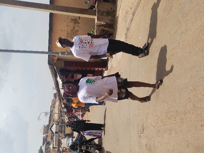 The image depicts an outdoor street scene in New Stadium, Nigeria, under bright daylight with distinct shadows cast to the subjects' right
