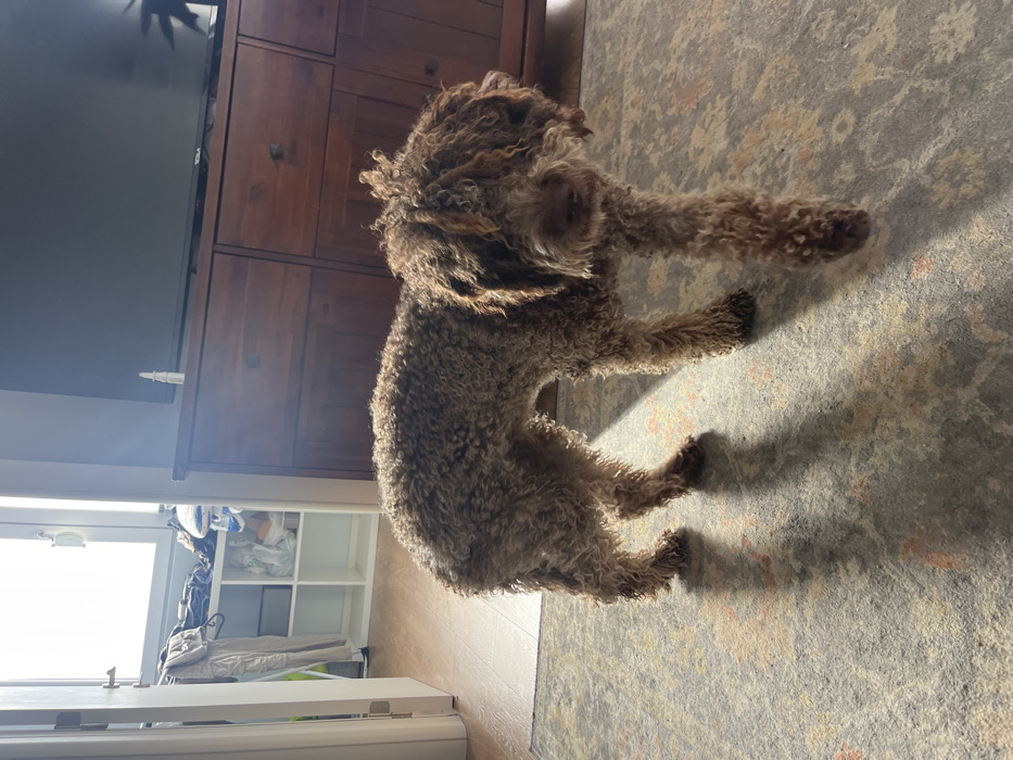 - "An indoor scene in Budva, Montenegro, depicts a medium-sized, brown, curly-haired dog standing centrally on a patterned rug" by FM-waqA53, licensed under CC BY 4.0