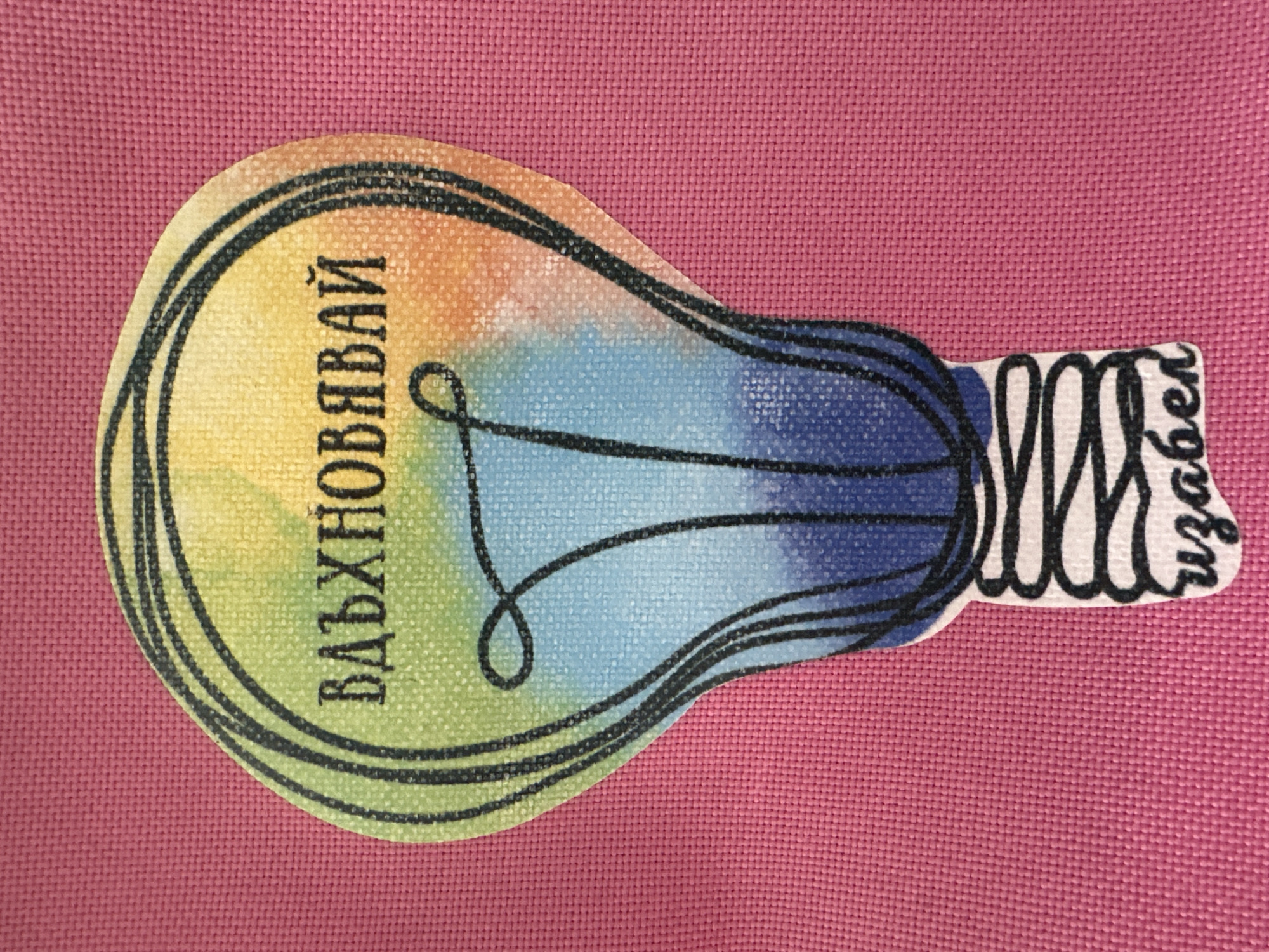 The image displays a single, die-cut sticker in the shape of a lightbulb, centrally positioned against a pink, woven fabric background