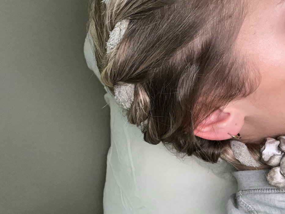 A close-up shot focuses on a person's side profile. Their hair, a blend of light brown and blonde, is styled in a braid interwoven with a light-colored towel. The braid wraps around the head and ends near the ear. A gold hoop earring is visible in the earlobe. A soft, scrunchie-like accessory and the collar of a gray sweatshirt appear at the bottom of the frame. A white pillow is partially visible beneath the head. The background is a muted gray.