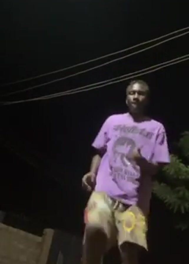 man dancing outdoors at night. He is wearing a purple t-shirt and patterned shorts. The environment is dark, with what appears to be a brick wall, foliage, and overhead wires visible. The video is shot from a low angle, looking up at the man as he moves.